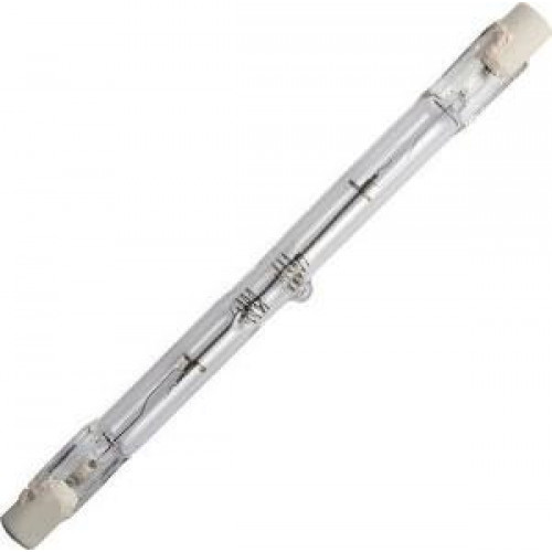 230 volt halogeen staaflamp geschikt voor bouwlampen en plafonnieres Eco variant, +- 20% besparing Vervangt 150watt dimbaar 2000 branduren 3000 kelvin 2230 lumen Afmeting: Hoogte 118mm Diameter 8mm