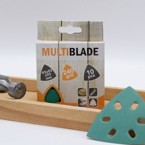 Multiblade MB94 professioneel schuurpapier in driehoekvorm met de afmetingen 93x93x93mm. Dit schuurpapier is universeel en voorzien van 6 stofgaten. Dit schuurpapier is zowel geschikt voor Hout als metaal en automotive. Het schuurpapier is verpakt in een set van 10 en heeft een grofheid van korrel 40 tot 400 en is voorzien van klittenband. Deze is geschikt voor onze schuurzool MB205 en MB151(S)